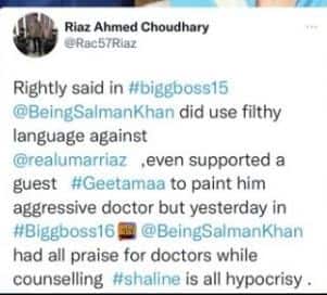 Riaz took a look at Salman and said it was in Bigg Boss 15 where the actor had insulted his son Umar for being a medical professional. Salman was the same person who disrespected doctors and today he is a hypocrite by educating Shalin. A few hours ago, Riaz had tweeted his opinion about the same from his unverified account and later deleted it. We took a screenshot of the same, as the tweet can’t be seen by its handle.