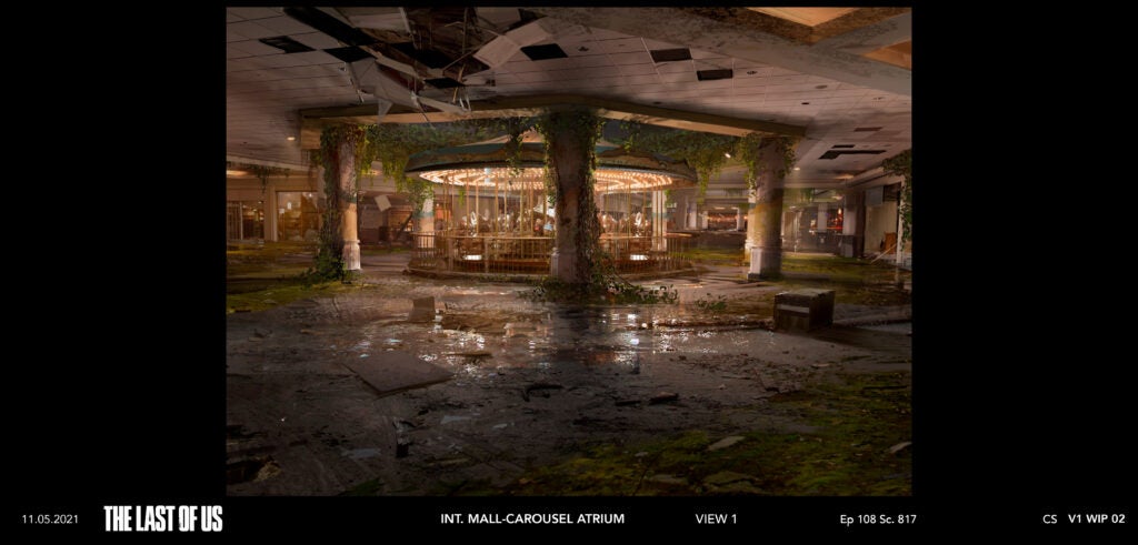 The interior of the mall set was also in need of some TLC combined with reverse engineering to represent its descent into disrepair. “Some of the things we made look crooked right off the bat, but carpenters have a hard time making things crooked,” he said. “We built very directly, and often our last layers of paint and wallpaper and molding were pulled out and distressed.” This included a cheeky used pop-up Halloween store written into the script, which set the stage for the episode’s more tragic events. Peno emphasized the theme of innocence and discovery through Ellie and Riley, saying, “We wanted to have an ethos of something that might seem tempestuous, but also kind of corny.”